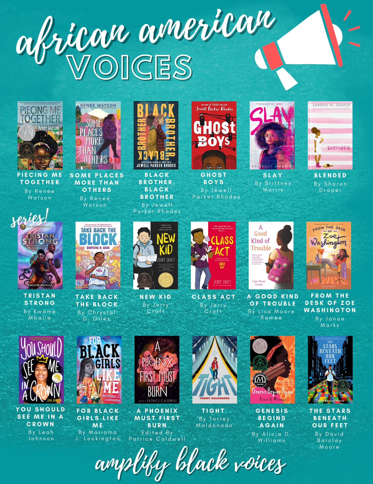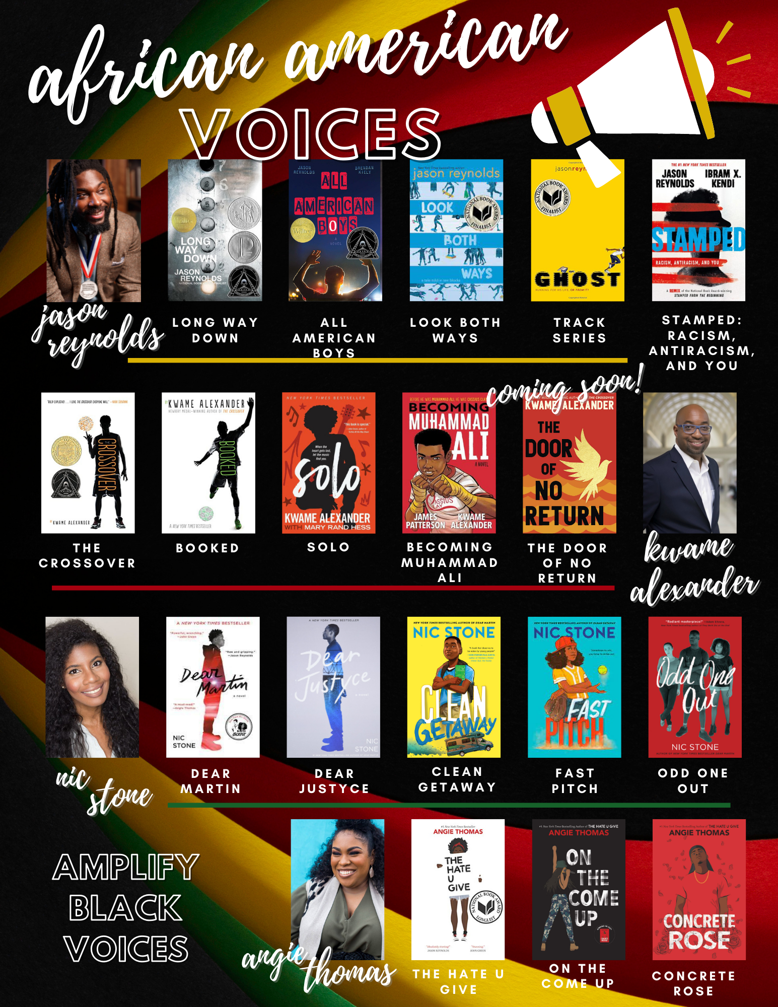 This list includes two versions. The first is a list of titles by popular black authors, including Jason Reynolds, Kwame Alexander, Nic Stone, and Angie Thomas. The second is a book list of titles by a variety of black authors. Both lists include Middle Grade and Young Adult novels.