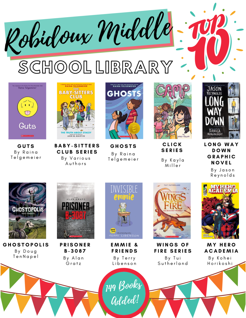 This list can be customized to include Top Ten Circulated Titles at the end of the school year, as well as number of new books added to the collection. List includes Middle Grade and Young Adult novels.