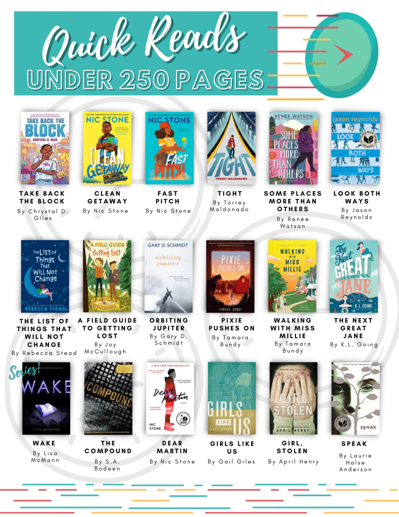 This list includes books that are all 250 pages or less in length. List includes Middle Grade and Young Adult novels.