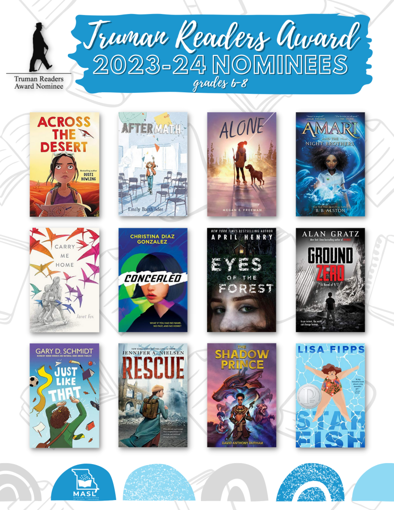 This list includes books that are 2023-24 Final Nominees for MASL’s Readers Awards. Lists include Show-Me, Mark Twain, Truman, and Gateway nominees.