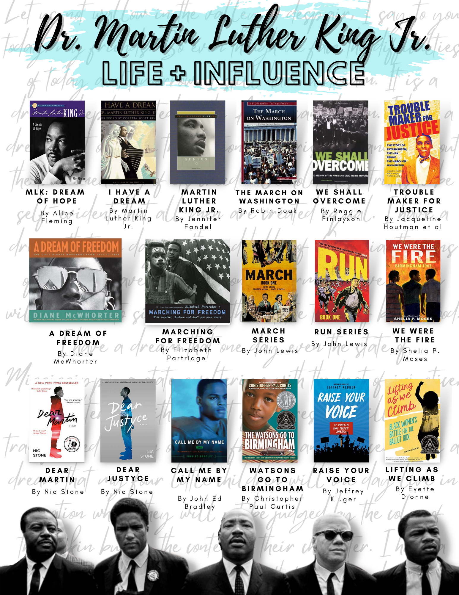 This list includes books that are about the life of Dr. Martin Luther King Jr. and/or showcase his influence on the Civil Rights Movement. List includes Middle Grade, Young Adult, Nonfiction, and Biography titles.