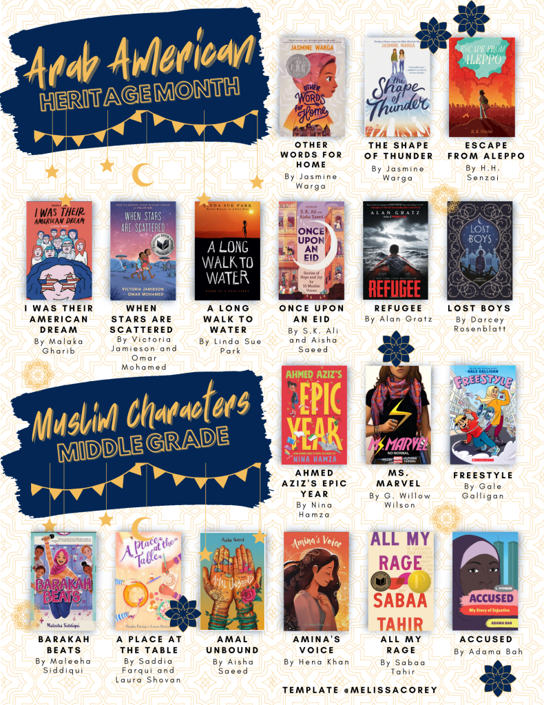 This list includes fiction and Nonfiction titles celebrating Arab American heritage. As well, titles featuring Muslim characters are included in honor of Eid. List includes Middle Grade Fiction and Young Adult Nonfiction and Fiction.