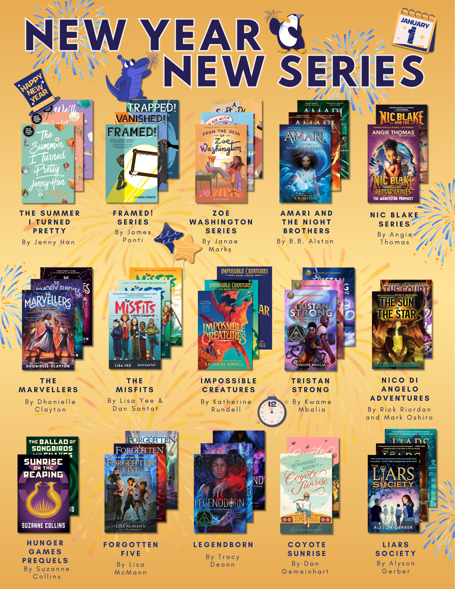 This list includes Middle Grade and Young Adult fiction titles in various popular series and/or new series. The first book in each series appears at the front of the stack of books.