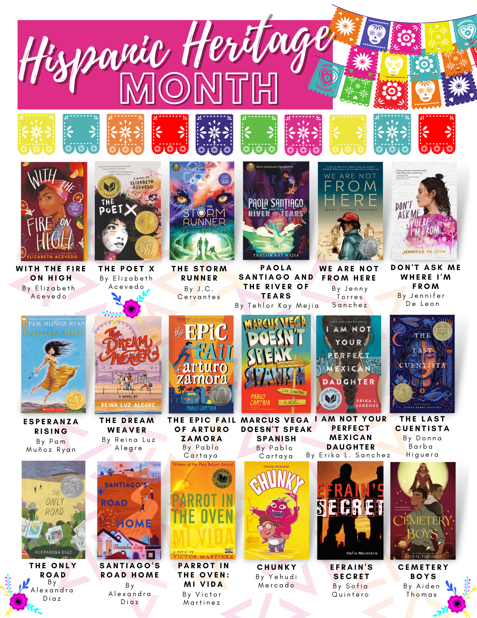 This list includes books that feature Hispanic and Latinx voices to celebrate Hispanic Heritage Month from Sept. 15th-Oct. 15th. List includes Middle Grade and Young Adult novels.