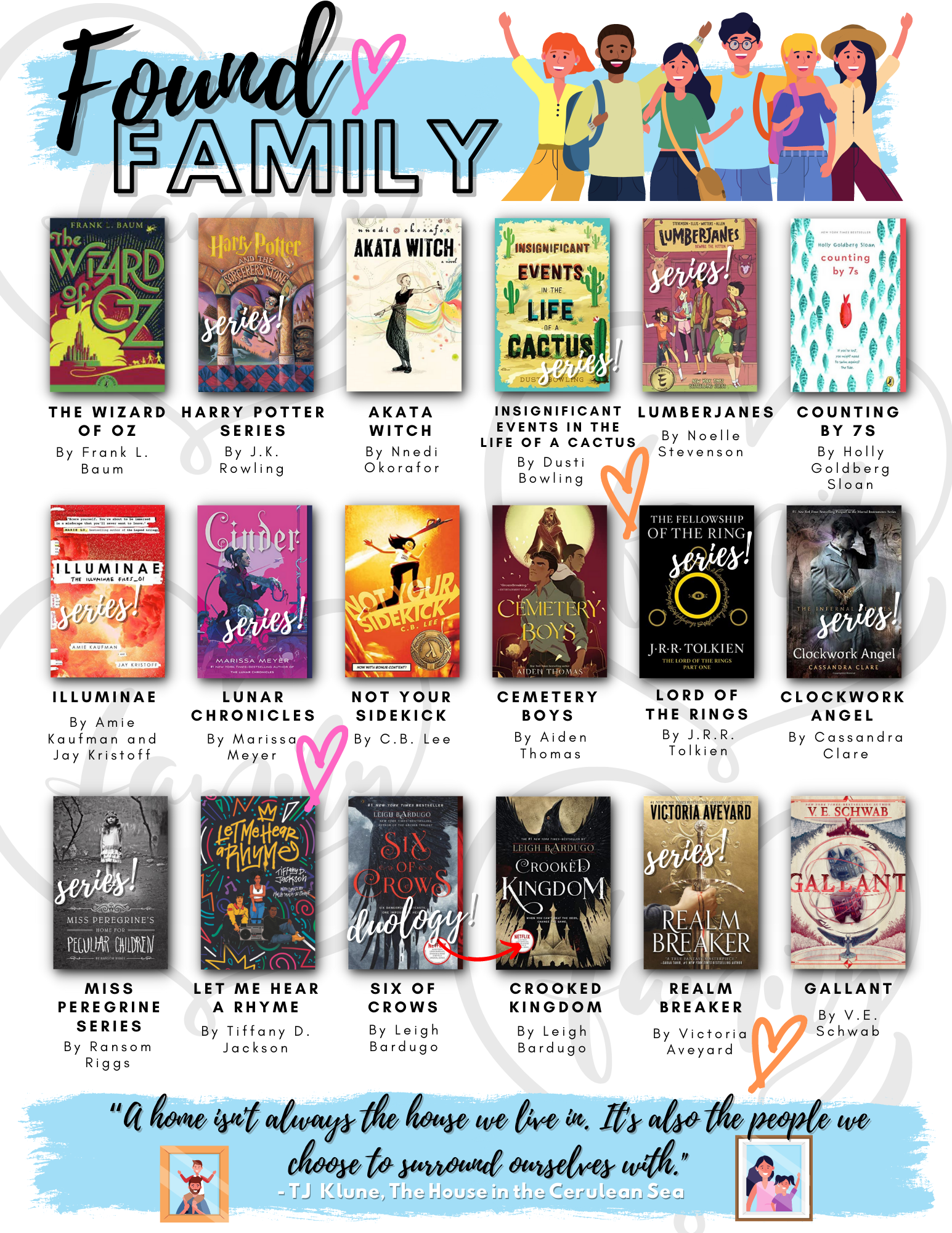 This list includes books that involve friendships, chosen family, and found family. List includes Middle Grade and Young Adult novels.
