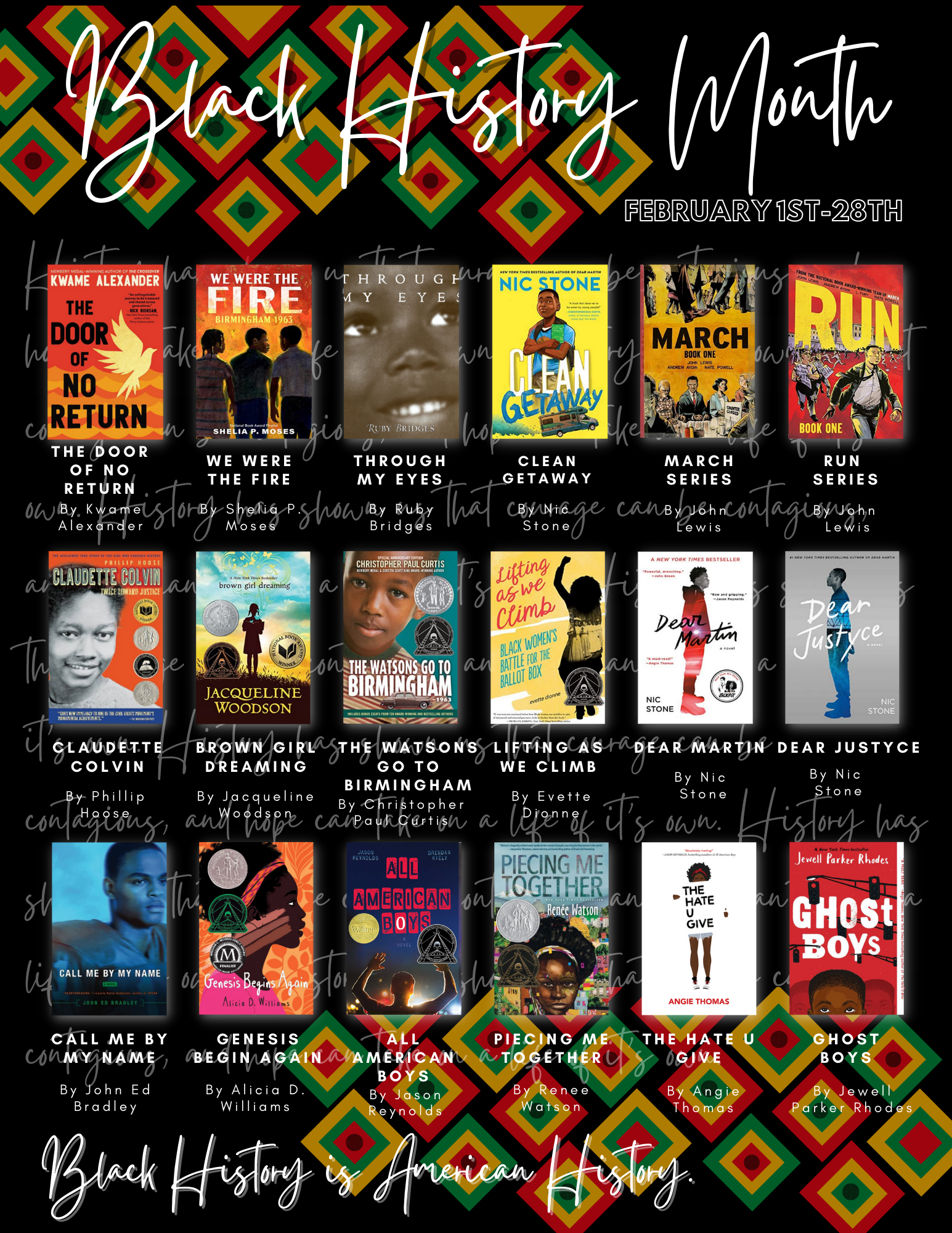 This list includes fiction and Nonfiction books highlighting topics, events, and individuals for Black History Month. List includes Middle Grade Fiction, Young Adult Fiction, Nonfiction, and Biography titles.
