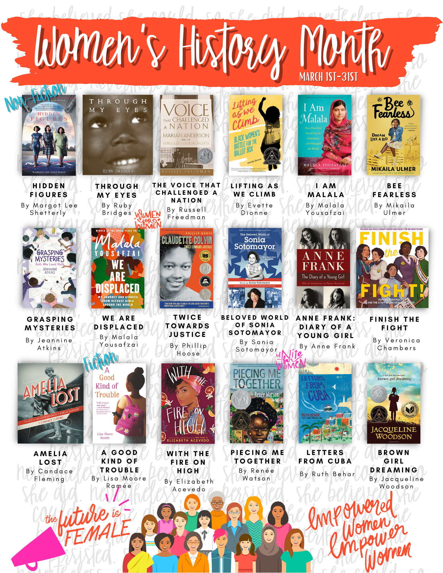 This list includes Nonfictionbooks that feature women who made history and/or fiction books with strong female leads from diverse backgrounds. List includes Middle Grade Fiction and Young Adult Nonfiction and Fiction.