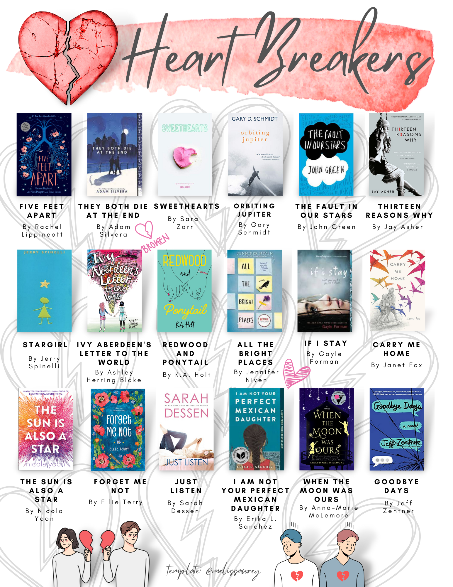 This list includes books that have romantic themes, sad themes, and/or heartbreak. List includes Middle Grade Fiction and Young Adult Fiction.