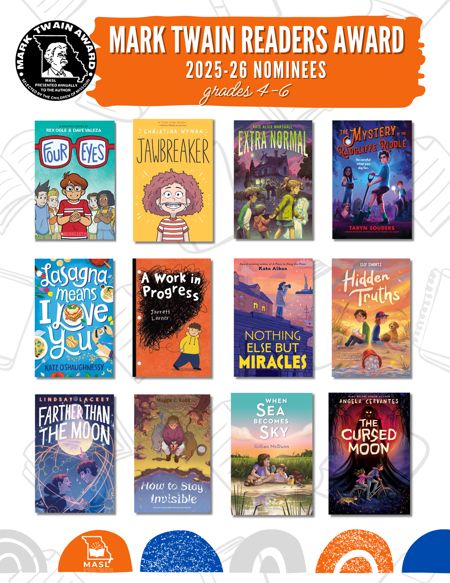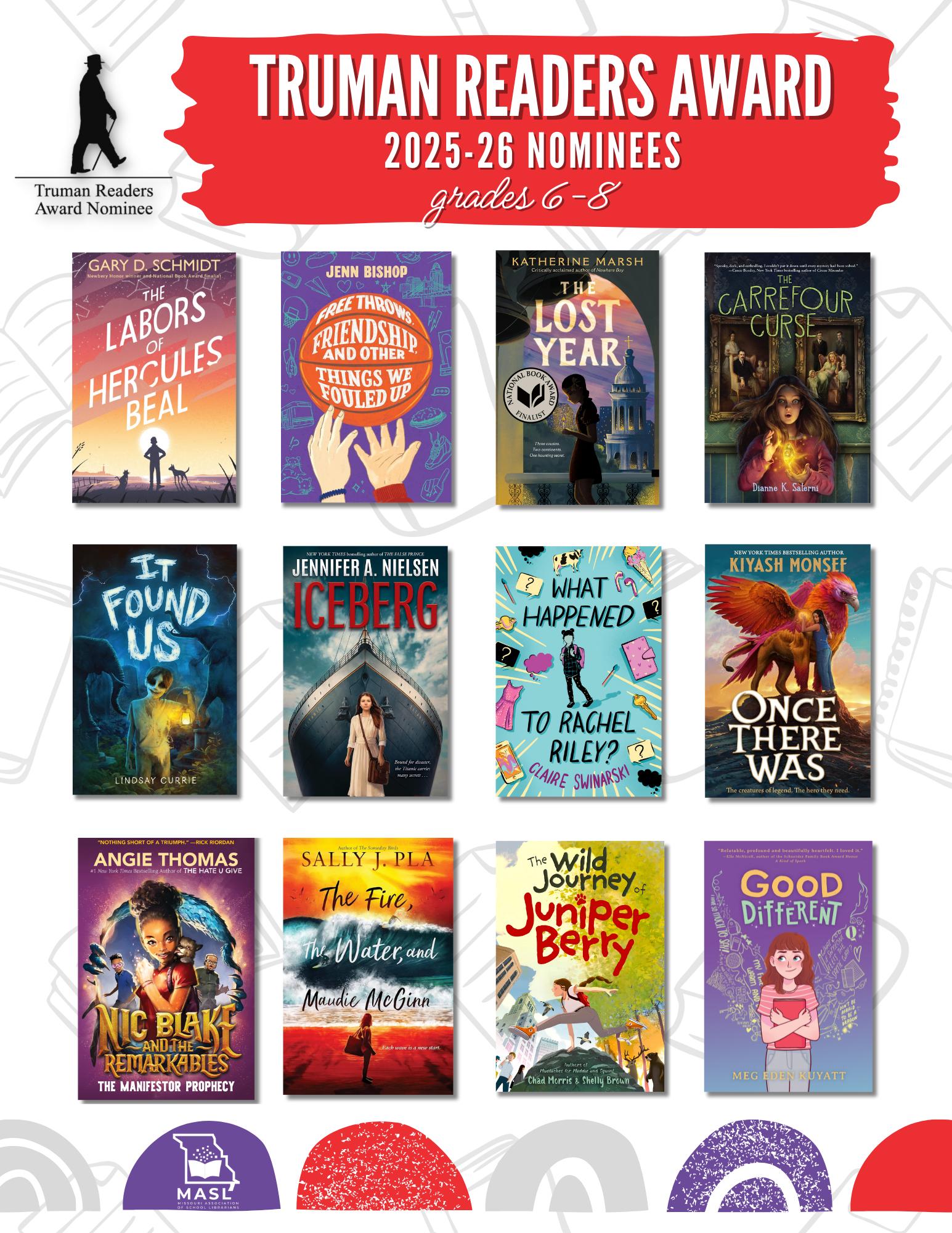 This list includes books that are 2025-26 Final Nominees for MASL’s Readers Awards. Lists include Show-Me, Mark Twain, Truman, and Gateway nominees.